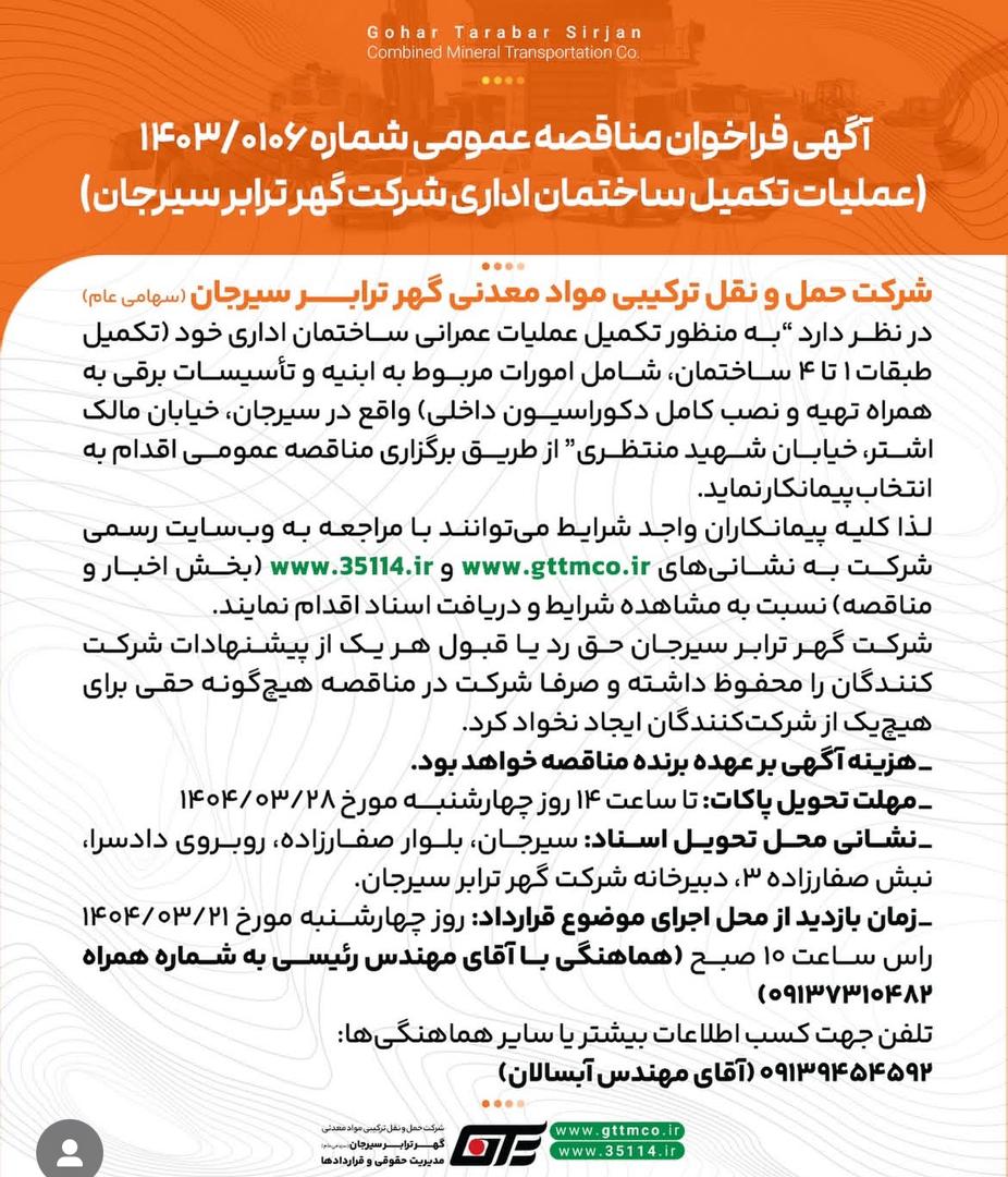 آگهی فراخوان مناقصه عمومی شماره ١۴٠٣/٠١٠۶ (عملیات تکمیل ساختمان اداری شرکت گهر ترابر سیرجان)