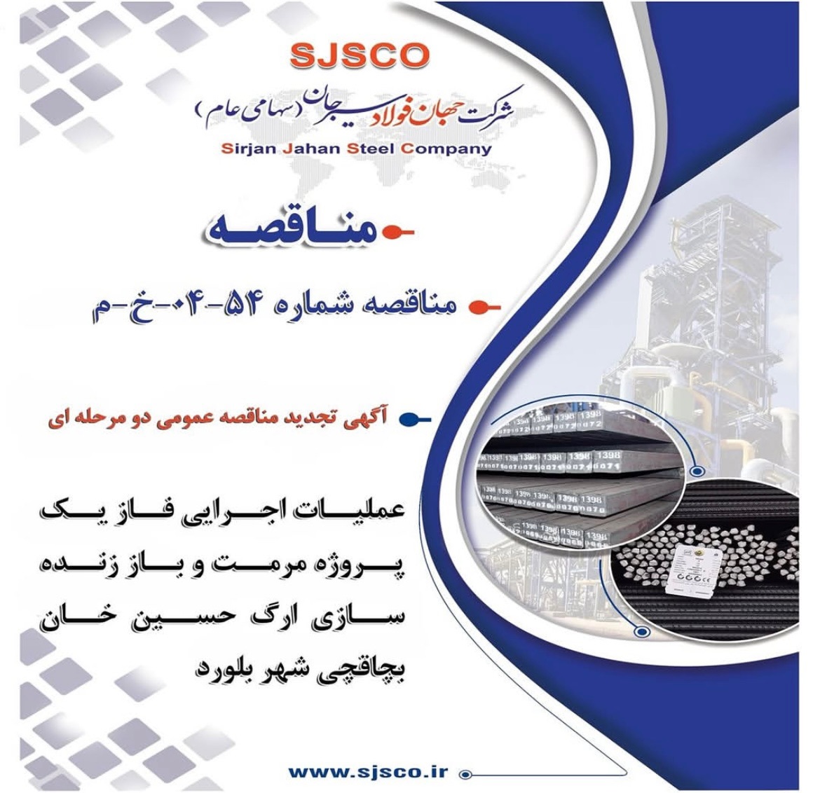 شرکت جهان فولاد سیرجان در نظر دارد نسبت به عملیات اجرایی فاز يك پروژه مرمت و باز زنده سازي ارگ حسين خان بچاقچي شهر بلورد از طریق برگزاری مناقصه عمومی دو مرحله ای اقدام نماید؛ لذا از تمامی پیمانکاران و شرکت های معتبر که دارای گرید 5 (پنج) مرمت آثار باستانی و بنای تاریخی، توانایی مناسب، سوابق و تجارب مورد قبول می باشند، دعوت به عمل می آید اسناد مناقصه را از طریق مراجعه به آدرس اینترنتی WWW.SJSCO.IR دریافت نمایند.